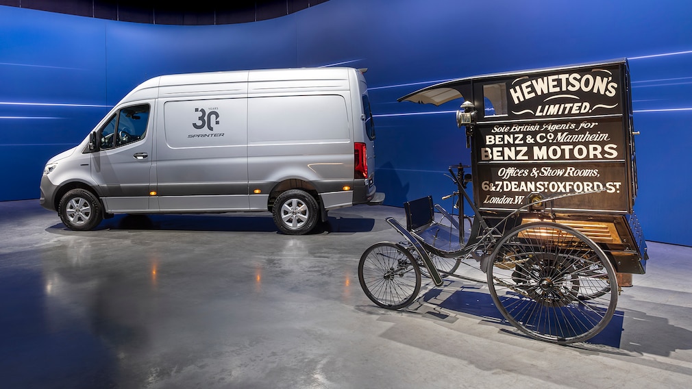 Fast 130 Jahre später baut Mercedes immer noch Lieferwagen: Der aktuelle eSprinter, quasi der Nachfahre des Benz'schen Ur-Transporters, ist ein Musterbeispiel dafür, wie die Idee von 1896 in die Zukunft fährt. Wo der Ur-Lieferwagen rumpelte, gleitet der eSprinter nahezu lautlos dahin.