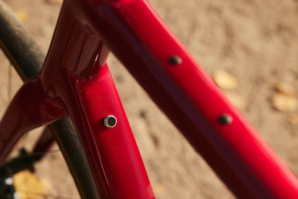 Auf dem Oberrohr sind Schraubpunkte für eine Tasche, im Rahmendreieck Fidlock-Knöpfe für eine passende Tasche von Roswheel.