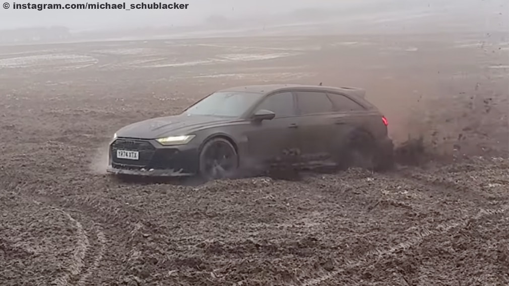 Das kürzlich gepostete Video (wurde auf den Accounts @michael_schublacker und @johnsimister gepostet) zeigt, wie ein RS 6 GT auf einen schlammigen Acker fährt und sofort mit der Frontspoilerlippe, die dem GT vorbehalten ist, aufsetzt. Das ist allerdings erst der Anfang: In den nächsten Sequenzen wird der in der Basis 219.355 Euro teure RS 6 GT mit Vollgas über das Feld geprügelt – und zwar ohne Rücksicht auf Verluste.