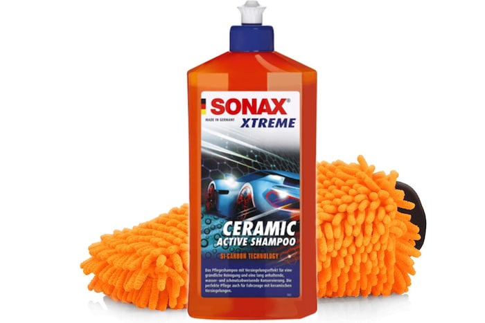 2. Reinigung mit Pflegemittel: Die Karosserie mit Autoshampoo einschäumen und mit der Bürste (auf Sauberkeit achten!) waschen.
