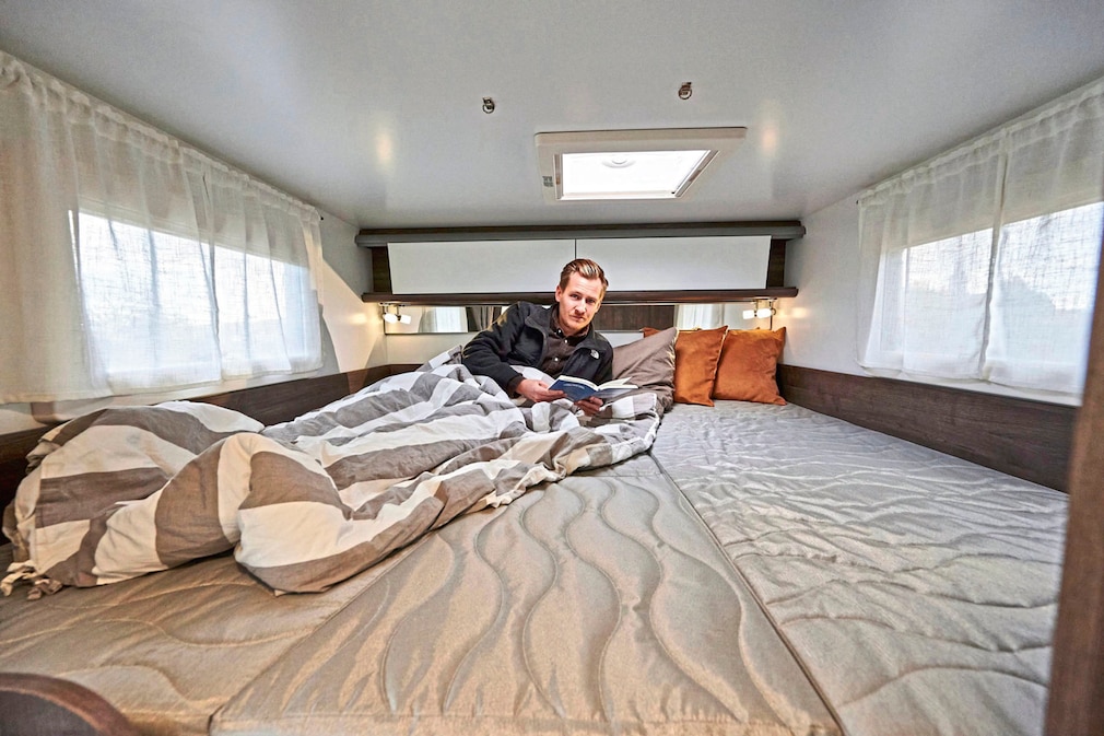 Bei solch einem Platzangebot wirken die Standardmaße des Badezimmers fast schon klein, obwohl dank Schwenkmechanismus Dusche und Waschbecken schick getrennt werden. Die Einzelbetten können ebenfalls zu einer großen Liegefläche werden, Platz für Kleidung ist in den beiden Schränken unter dem Bett oder im Hängeschrank darüber vorhanden.