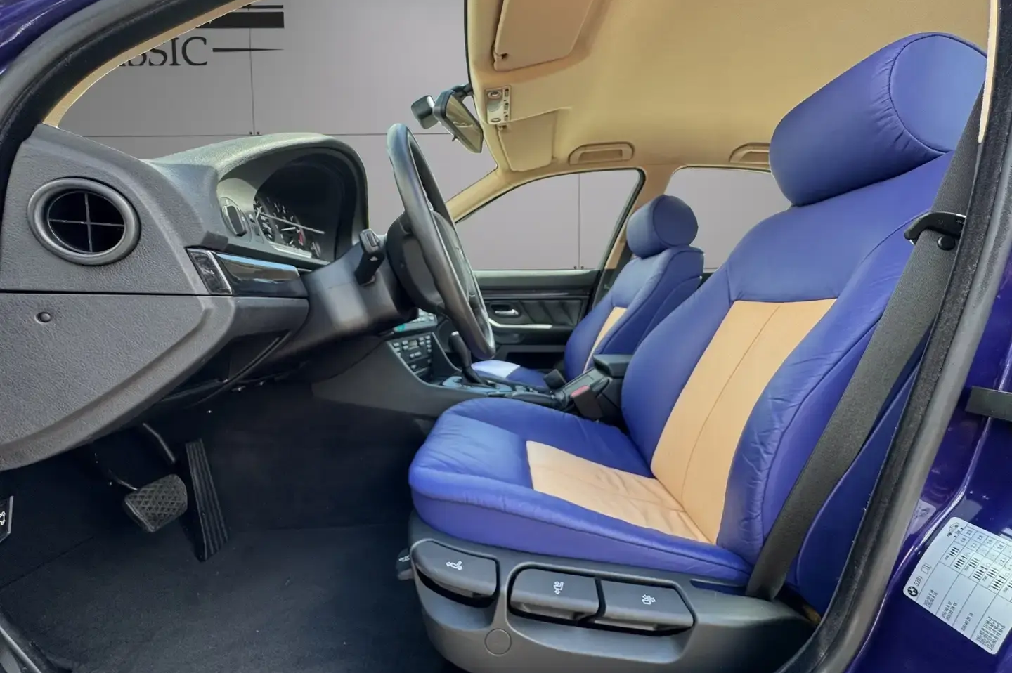 Auf den Fotos hinterlässt der E39 einen makellosen Eindruck. Weder außen noch innen sind Gebrauchsspuren, geschweige denn Beschädigungen erkennbar. Neben der unglaublich niedrigen Laufleistung macht die Farbkombination den 5er endgültig zum Sammlerstück. Es scheint, als habe sich der Erstbesitzer beim Individual-Programm so richtig ausgetobt. Die Außenfarbe hört auf die Bezeichnung "Velvetblau Metallic" und wurde mit einer passenden, aber durchaus gewagten Sonderpolsterung in "Bicolor blau/beige" kombiniert.