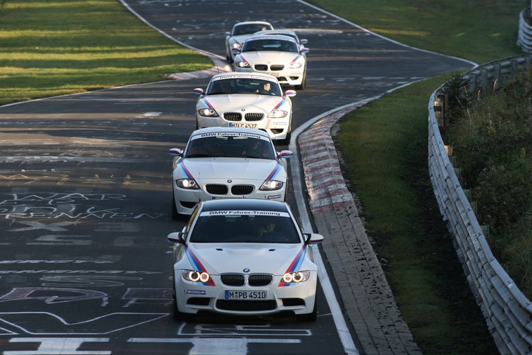 Respekt vor der Nordschleife haben sie spätestens seit dem Briefing vom Vorabend. Die Instruktoren um Tourenwagen-Legende Harald Grohs kennen unzählige Geschichten, berichten von wenige Meter breiten Auslaufzonen, hängenden Kurven und der Möglichkeit zur Kaltverformung an fast jeder Leitplanke entlang der über 20 Kilometer langen Achterbahn durch die Eifel. Angst ist dennoch Fehl am Platze: In den kommenden vier Stunden fahren sie wie an der Perlenschnur aufgereiht in zwei Gruppen hinter den Instruktoren Fritz Lanio und Harald Grohs her, lernen die Ideallinie und die Tücken den Strecke. Und erfahren, wie weit der Grenzbereich des M3 jenseits des "ESP im Kopf" liegt. Bereits auf der ersten Runde wird klar, was Lanio meinte, als er sagte, dass die Strecke niemals gleich ist. Während die Sichtverhältnisse auf der Döttinger Höhe noch gut sind, fährt die schnelle Kolonne kurz vor der "Breidscheider Brücke" in eine Nebelwand und der Bordcomputer des M3 warnt bei nur noch drei Grad Außentemperatur vorsorglich vor Eisgefahr.