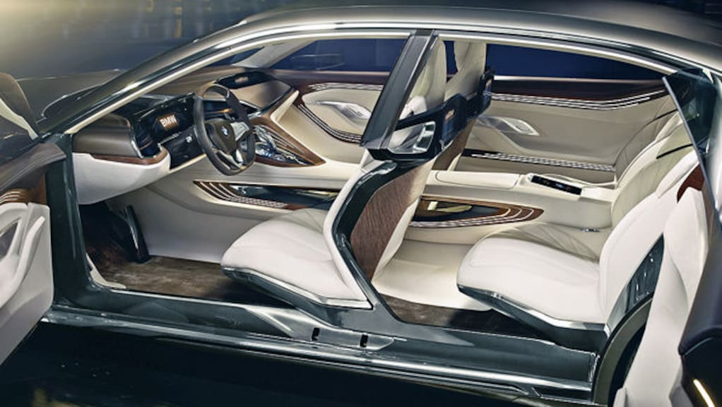Der BMW der Zukunft ist eine Fusion aus bestem Design, neuester Leichtbautechnik, zukunftsweisender Technik und optimaler Bedienung. Wie sich die Bayern das vorstellen, zeigt eine Studie namens BMW Vision Future Luxury, die der Hersteller auf der Peking Motor Show 2014 präsentiert. Das Auto soll höchsten Ansprüche von Fahrern wie Mitreisenden genügen und lässt sich daher auf den Nenner bringen: BMW will einen bayerischen Maybach bauen. Branchenintern wird vom Vorbild für einen BMW 9er gesprochen. Die Studie kommt als langgestreckte Limousine daher, die sich elegant über die Straße duckt. Die Doppelniere am Bug ist zu ungeahnter Größe erwachsen, der Über-BMW blinzelt aus schmalen Scheinwerferschlitzen, hinter denen doppelflutige Laserscheinwerfer sitzen. Die Dachlinie fällt nach Art eines Coupés flach zur Kofferraumklappe ab für einen minimierten Luftwiderstand. Im Heck leuchten erstmals bei BMW organische Leuchtdioden (OLEDs), die ganzflächig glimmen und in L-Form arrangiert sind.