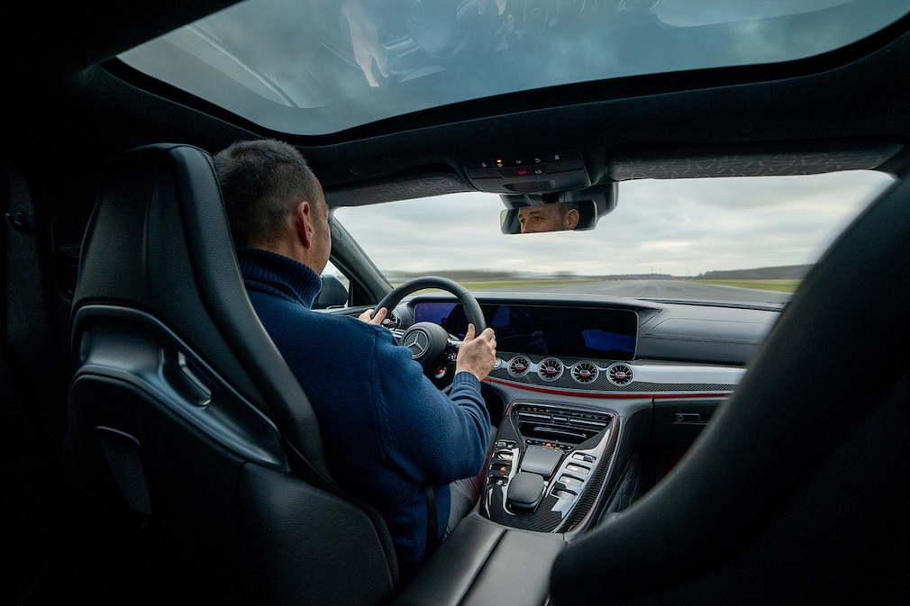 Und der übliche Krawall ist ja nur einen Kickdown entfernt - oder einen Dreh am Mode-Schalter im Lenkrad. Denn dann spannt der GT nicht nur die Nerven an und öffnet die Schallklappen im Auspuff, sondern dann zündet die Rakete auch ihren Hauptbrenner: Wo sie sich in Affalterbach mit vier Litern Hubraum sowie 639 PS und 900 Nm für den V8 begnügen und auch das bisherige Brabus-Flaggschiff Rocket 930 nur den Vierliter bekommen hat, quetscht Brabus nun seinen 4,5 Liter in den Bug und steigert den Verbrenner so auf 796 PS und 1250 Nm. Zusammen mit der E-Maschine stehen dann unglaubliche 735 PS im Datenblatt und in der Theorie 1820 Nm, die selbst Actros-Fahrern einen gewissen Respekt abringen. Leider allerdings auch dem Getriebe. Weshalb Brabus die Kraft auf 1620 Nm limitiert, weil die Wellen sich sonst winden würden wie die Handtücher bei Aufguss in der Sauna. Aber keine Sorge: Ins Schwitzen kommt man hier auch so.
