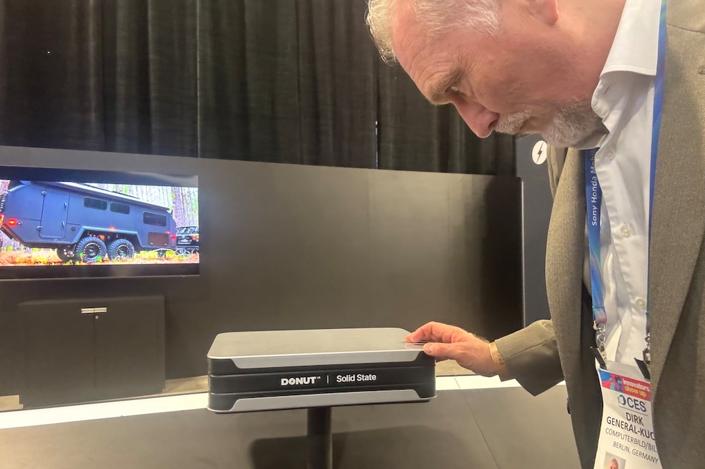 Der Donut-Lab-Feststoffakku soll in Serie kommen, hier steht ein Exemplar auf der CES in Las Vegas.