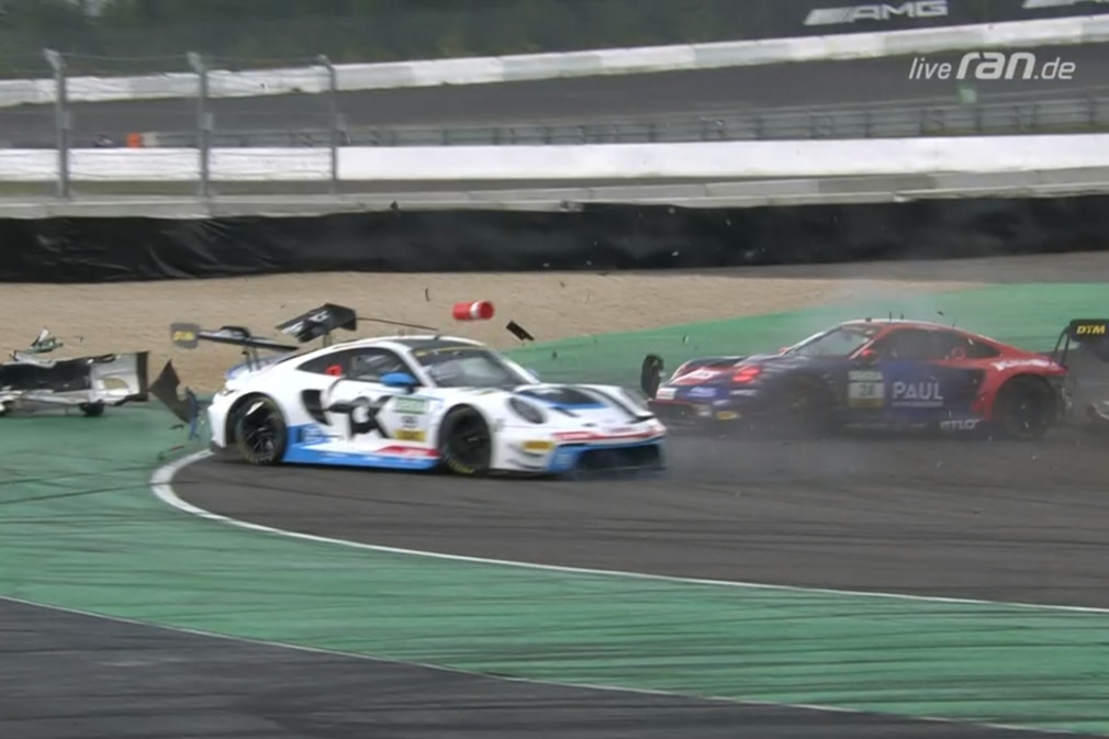 Die nötige Prise Spannung liefert am Samstag in der Eifel einmal mehr das Wetter: Bei für August ohnehin extrem niedrigen Asphalttemperaturen von nur 17 Grad, sorgt ab Rennmitte ein Schauer für Chaos. Heftig ist dabei vor allem der Crash von Christian Engelhardt, der auf der nassen Fahrbahn hin zu Kurve eins sein Auto verliert und Porsche-Kollege Ayhancan Güven voll abräumt - beide Fahrer überstehen den harten Einschlag zum Glück unverletzt.