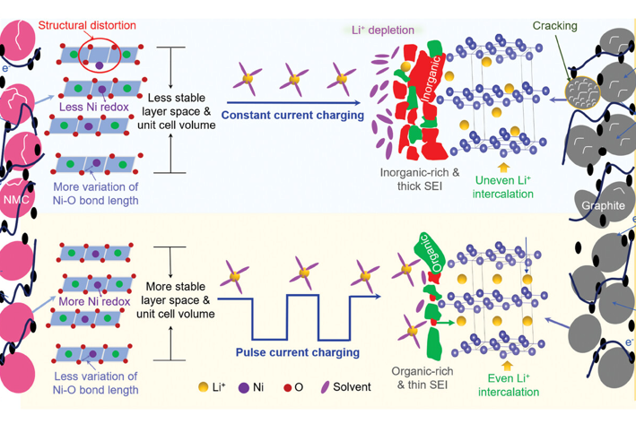 Anschließend wurde der so geladene Akku zerlegt und die Elektroden untersucht. Ergebnis: Insbesondere die Graphit-Anode war erkennbar weniger geschädigt als die konventionell geladene. Die so genannte Festkörper-Elektrolyt-Zwischenschicht (SEI), die den Elektronenfluss behindert, war dünner. "Das Aufladen mit gepulstem Strom fördert die homogene Verteilung der Lithium-Ionen im Graphit", so Yaolin Xu vom Helmholtz Zentrum Berlin (HZB).