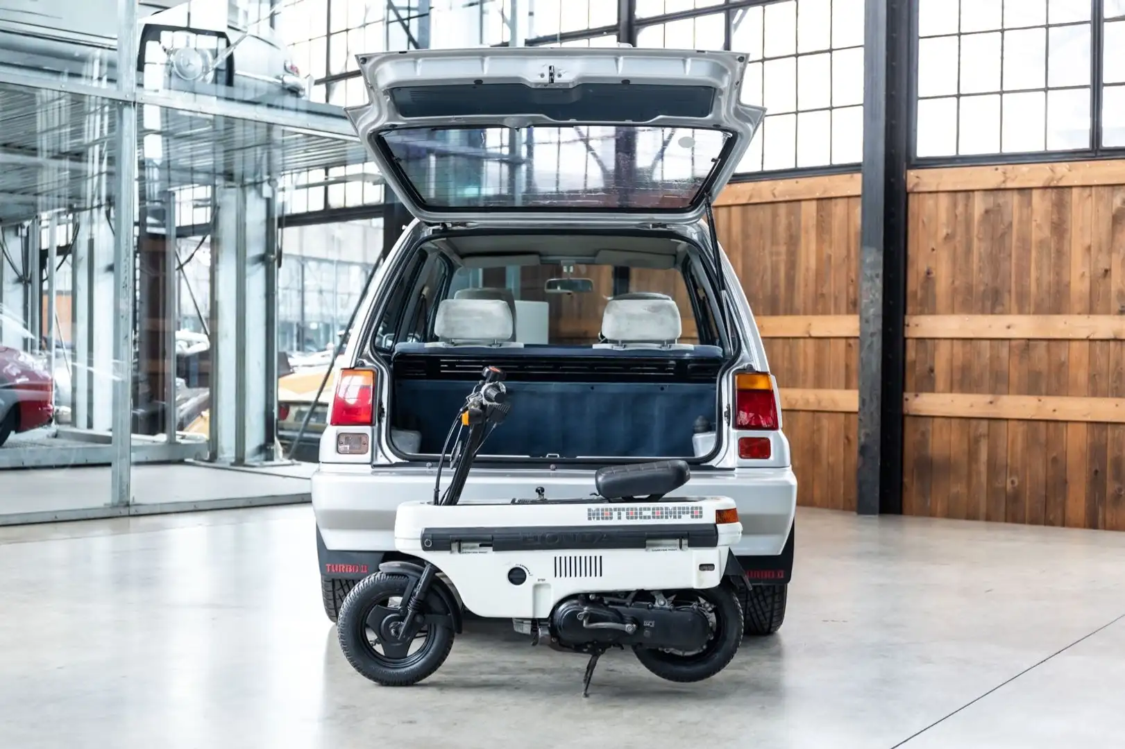 Das faltbare Motocompo passt perfekt in den Kofferraum des Honda City Turbo II. Mittlerweile ist das kleine Moped eine gesuchte Rarität.
