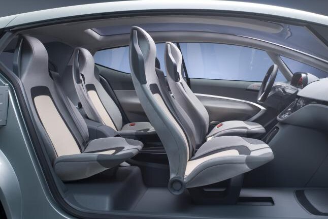 Blickfang im Interieur ist das Panoramadisplay im Format 1,20 x 0,10 Meter direkt unterhalb der Frontscheibe. Seine Anzeigefelder lassen sich frei konfigurieren. Sie können beispielsweise ein Rundumbild von der Umgebung des Fahrzeugs liefern, die von vier Kameras beobachtet wird. Alternativ können die Displays auch Informationen über das Auto oder das Infotainment-System zeigen. In der Mittelkonsole findet sich ein zweites Display mit Touchscreen-Bedienung. Oben sitzen programmierbare Tasten, deren Ein-Knopfdruck-Bedienung an die Shortcut-Funktion von Computern erinnert. Sie erleichtern den Zugang zu den diversen Menüs für Klima, Infotainment oder Navigation. Die Tasten sind frei programmierbar und können daher an neue Infotainmentgeräte angepasst werden. Die Passagiere genießen das futuristische Ambiente auf an der Mittelkonsole aufgehängten Einzelsitzen.