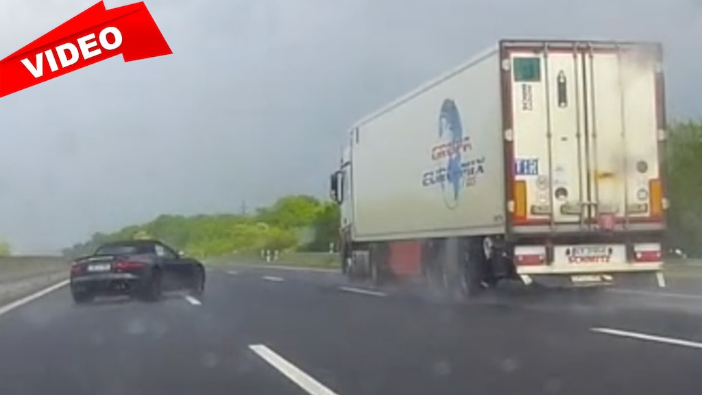 Das war mal richtig knapp: Auf einer regennassen Autobahn hätte es einen Jaguar F-Type beinahe erwischt. Mit blitzschnellen Reaktionen konnte der Fahrer einen Unfall aber gerade noch verhindern!