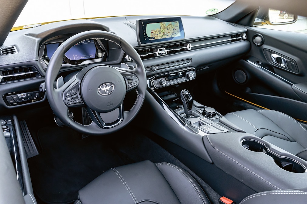 Bevor es um Performance geht, ein Blick ins Cockpit: Während sich der Supra äußerlich absolut eigenständig gibt, sogar geschichtsbewusst mit seinem "Double-Bubble"-Dach den Toyota 2000 GT aus den späten Sechzigern zitiert: Innen ist bis aufs Kombiinstrument und die Sitze wirklich fast alles eins zu eins BMW, vom Automatik-Wählhebel über das Lenkrad bis hin zum kleinen Ablagenetz im Kofferraum. Sogar das glockenhafte BMW-"Pling", das als Warnton fungiert, hat Toyota einfach übernommen. Da wäre etwas mehr Eigenständigkeit schon wünschenswert gewesen.