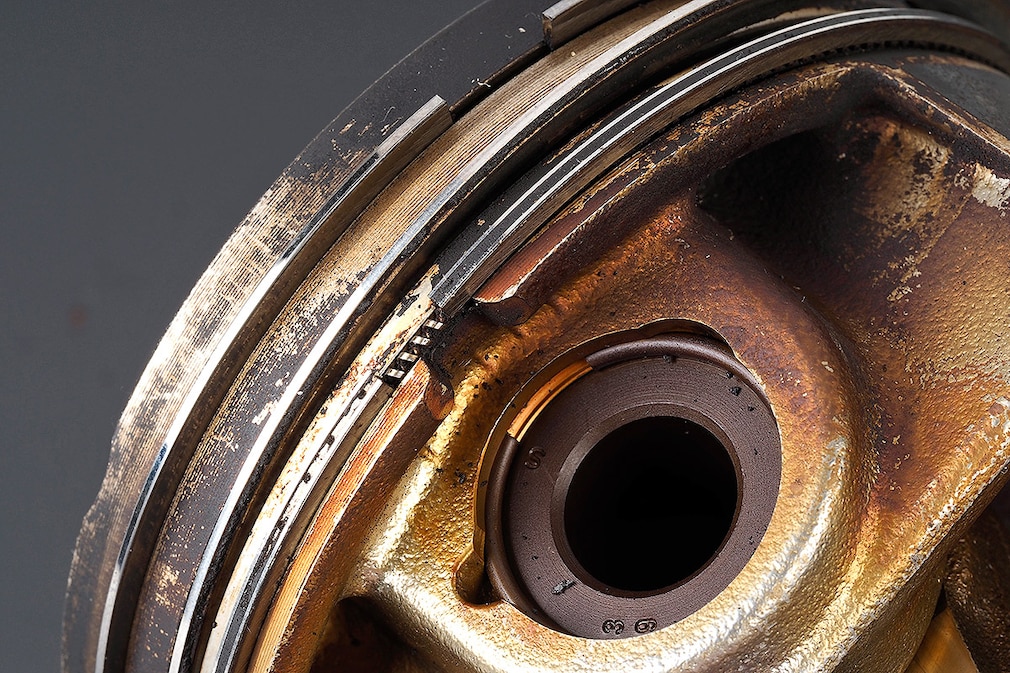 Ein weiterer Nebeneffekt der zu schmalen Ringe: An den Kolben kommt es zu Verkokungen, die im Extremfall bis zum Motorschaden führen können.