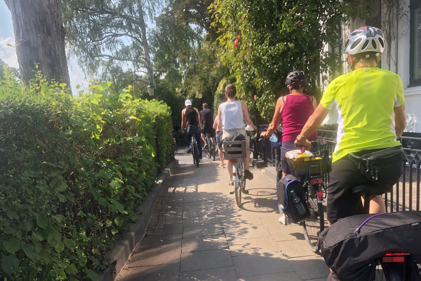 Schon bald biegt man auf den Alsterwanderweg ein und kann entlang der Außenalster Tempo und Strecke machen. Aber Obacht, Sie teilen sich den Weg mit Pendlern, die vom Norden in die City radeln, Joggern, Spaziergängern mit und ohne Hund. Rücksicht wird hier per Beschildern angewiesen. Nach zehn zügigen Kilometern ist die unterbrechungsarme Fahrt vorbei, jetzt geht's mitten durch die City zum Ohlsdorfer Friedhof, der mit 389 Hektar größte Parkfriedhof der Welt. Über 200.000 Grabstätten verteilen sich über das Gelände – Fahrradfahren gilt hier nicht als pietätlos, muss man wissen.