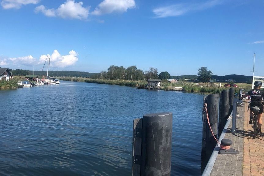 Zuerst folgt der Track ein paar schönen Feldwegen entlang der herrlich blauen Ostsee, dann aber wird die Strecke für gut 30 Kilometer fast ein wenig langweilig. Nicht falsch verstehen, hier lässt sich eine vortreffliche Radtour fahren. Einzig, das Meer ist für lange Zeit nicht zu sehen und auch die Wege sind für Gravelfans etwas langweilig. Richtig schön wird es dann wieder bei Kilometer 58, kurz vor Vaschvitz, wo man schon die Enge für die Fährfahrt erahnen kann.