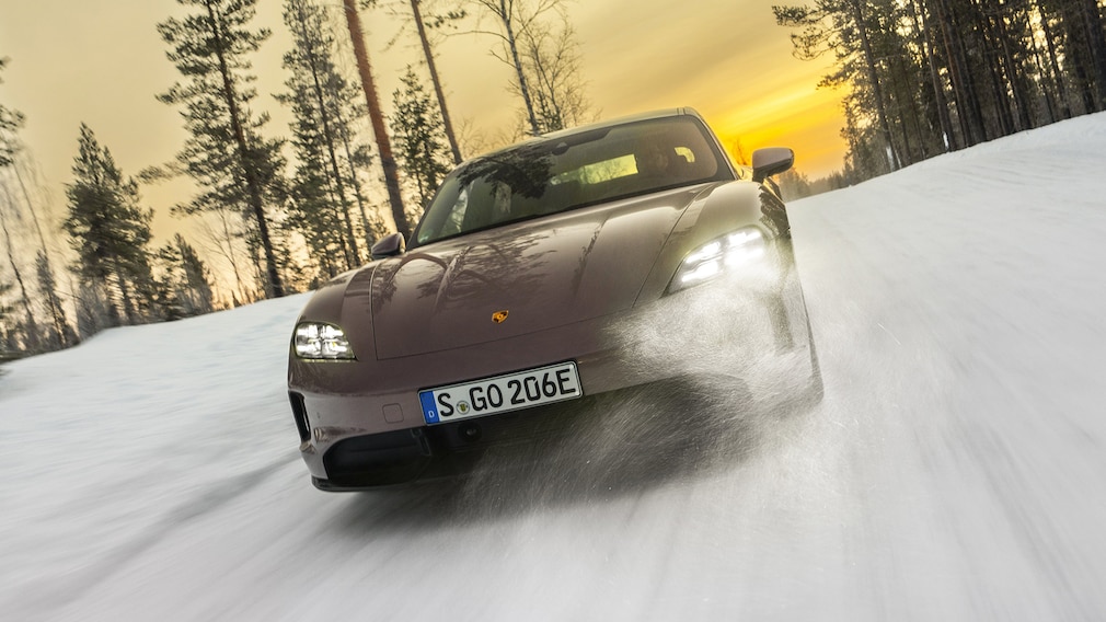 Umstieg in den Taycan mit Heckantrieb. Wer hier nicht sofort mit Samtschuhen agiert, bringt die Hinterräder unweigerlich zum Durchdrehen, endet blitzschnell in einem Dreher. Das PSM leistet eingeschaltet ganze Arbeit. Trotzdem: Die Allrad-Variante spielt auf Schnee und Eis einfach in einer ganz anderen Liga.