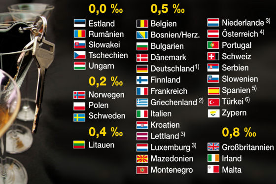 Wer im Ausland unterwegs ist, sollte peinlich genau auf seinen Alkoholkonsum achten: Ein Bier kann bereits zuviel sein. Mehr als 0,5 Promille Alkohol im Blut erlaubt kaum ein europäisches Land. Nur drei Inselstaaten machen eine Ausnahme.