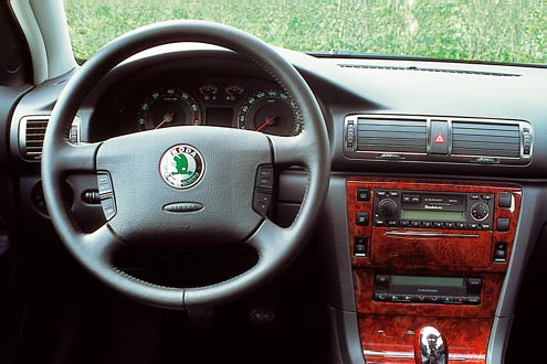 Passt sich der äußerlichen Erscheinung an: das Cockpit des Tschechen.Die Rundumsicht in der Stufenhecklimousine ist so hervorragend wie die eingesetzten Materialien und die Verarbeitung. Für die gute Fahrerposition sorgen sowohl die elektrische Sitzverstellung als auch die ergonomisch geformte Armaturentafel. In dem vertikal und axial verstellbaren Vierspeichenlenkrad und der fast bis zu den Rücksitzen reichenden Mittelkonsole setzt sich die durchdachte Innenraumgestaltung fort. Zwischen den Vordersitzen befindet sich die temperierte "Travel-Box", deren Deckel zugleich als Armstütze für Fahrer und Beifahrer dient. Zahlreiche Ablagefächer bieten ausreichend Stauraum für Reiseutensilien. Im Kofferraum ist ausreichend Platz für normales Reisegepäck. Das Innenraum-Design ist zwar wohltuend zurückhaltend. Wurzelholz-Applikationen sind allerdings ein glatter Stilbruch. Wertung: 90 von 100 Punkten