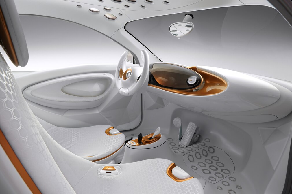 Smart forvision: Wer dabei an einen neuen forfour denkt, der wird enttäuscht: Die Studie forvision auf der IAA 2011 lässt erahnen, wie der fortwo der Zukunft aussehen könnte. 2014 soll es so weit sein – und da scheinen uns einige Überraschungen zu erwarten. Weil Smart für das Concept Car mit BASF kooperiert hat, trägt der forvision einige Technikschmankerl in sich, die alle entweder wirklich seriennah oder in ihrer Entwicklung bereits weit fortgeschritten sind. Dabei setzt die Studie auf geringes Gewicht, nutzt Energie besonders effizient und soll auch beim Temperaturmanagement neue Wege fahren. Ein Elektroantrieb, zu dessen Leistung sich Smart nicht näher äußert, sorgt für sauberen Vortrieb. Bei der Optik verleugnet der forvision den künftigen fortwo nicht. Alles fällt etwas runder und knubbeliger aus und wird mit zahlreichen Sicken aufgepeppt, dazu kombiniert Smart eine weiße Karosserie mit einer kupferfarbenen Sicherheitszelle. Der Glanzeffekt im Lack wird mit Alu-Partikeln erzeugt, das soll für wechselnde Effekte je nach Lichteinfall sorgen.