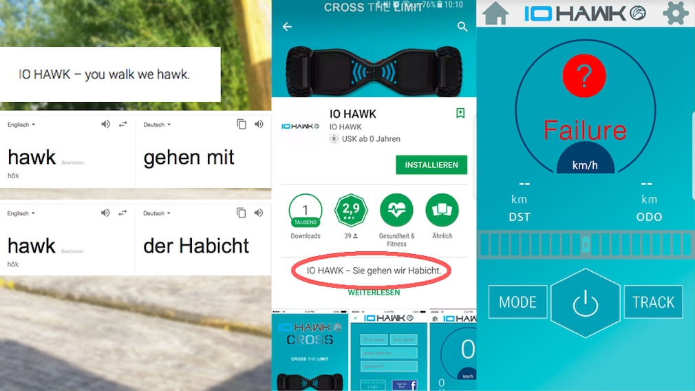 Die IO-Hawk-App hat nicht gerade tolle Bewertungen. Viele beklagen sich über die mangelnde Zuverlässigkeit. Ich hatte im Test nur eine Fehlermeldung. Besonders schön ist die Übersetzung des Claims: „Sie gehen wir Habicht” – na dann ...