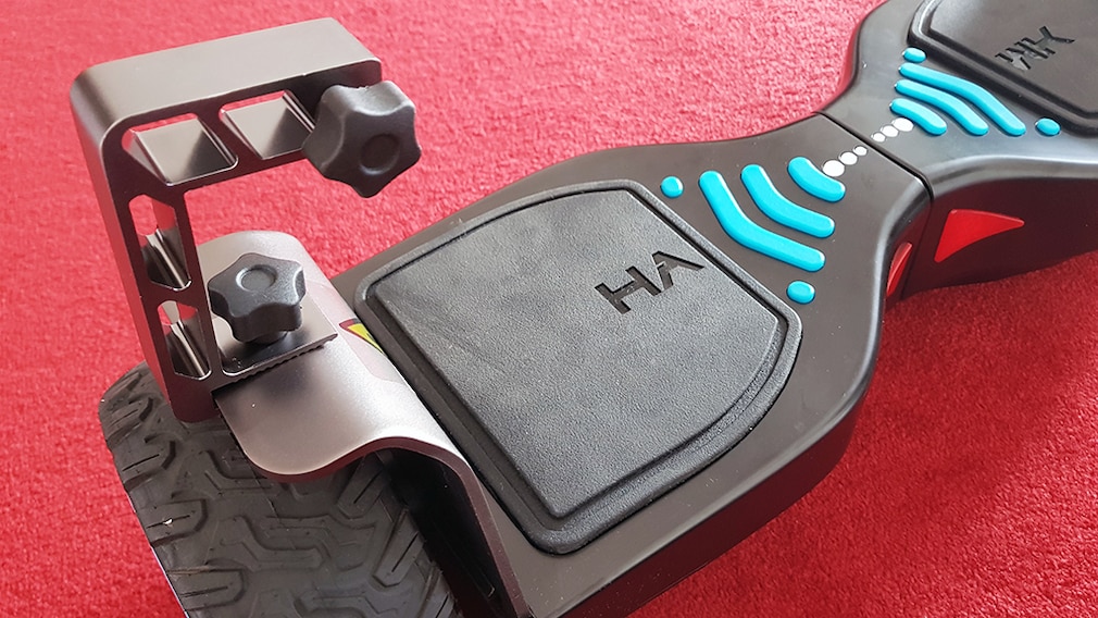 Mit 11 kg ist das Cross auch als Mini kein Leichtgewicht, im Vergleich zum großen Bruder IO Hawk Cross speckt es aber immerhin 4 kg ab. Es ist kleiner und deutlich günstiger: Die UVP liegt bei 399 Euro. Das Cross Mini kommt sehr robust daher. Die kleinen Schutzbleche sind aus Aluminium. Ein Vorteil gegenüber anderen Hoverboards, deren Kunstoffabdeckungen viel mehr vom Rad umschließen und einen Zusammenstoß schon mal mit einem Riss oder Bruch quittieren. Die geschundenen Ausstellungsstücke in Geschäften können ein Lied davon singen. Im Gebäude kriegen Sie den IO Hawk Cross Mini kaum kaputt. Einschläge in die Wand lassen ihn kalt. Für richtige Schrammen müssen Sie schon raus auf die Straße ...
