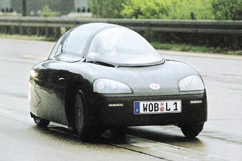 Die Studie verbraucht 1,38 Liter auf 100 Kilometer und wird von einem 36 PS starken Zweizylinder-Diesel angetrieben, der auch von elektrischen Komponenten unterstützt wird. Mit an Bord ist auch ein besonders schnell schaltendes Doppelkupplungsgetriebe (DSG) mit sieben Gängen. So stößt der L1 nur 36 Gramm CO2 pro gefahrenem Kilometer aus. Der 3,80 Meter lange VW ist ein aerodynamisches Meisterwerk. Die Karosserie hat kaum Fugen und Kanten, statt normaler Außenspiegeln gibt's nur zwei Videokameras, die den Blick nach hinten auf Displays im Cockpit wiedergeben. Sämtliche Lufteinlässe für Frisch- und Verbrennungsluft werden von Klappen automatisch verschlossen, wenn sie nicht benötigt werden. Sogar die Hinterräder sind vollständig von der Karosserie umschlossen.