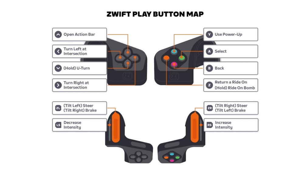 Die Zwift Play-Controller werden mit Silikonbändern am Fahrradlenker befestigt. Bei Bedarf kann der Controller damit auch schnell wieder entfernt werden, wenn er nicht mehr genutzt wird. Auf der linken Seite ermöglichen vier Pfeilkasten die Menüsteuerung sowie U-Turns während der virtuellen Zwift-Fahrt im Spiel. Rechts sind vier weitere Tasten am Controller, denen unterschiedliche Farben bzw. Buchstaben zugeordnet sind. Mit diesen Tasten kann man beispielsweise sogenannte Ride-Ons (vergleichbar mit Likes) geben, Power-ups nutzen oder Trainingsblöcke überspringen. Beide Controller verfügen außerdem über ein Paddel mit Lenk- und Bremsfunktionen.