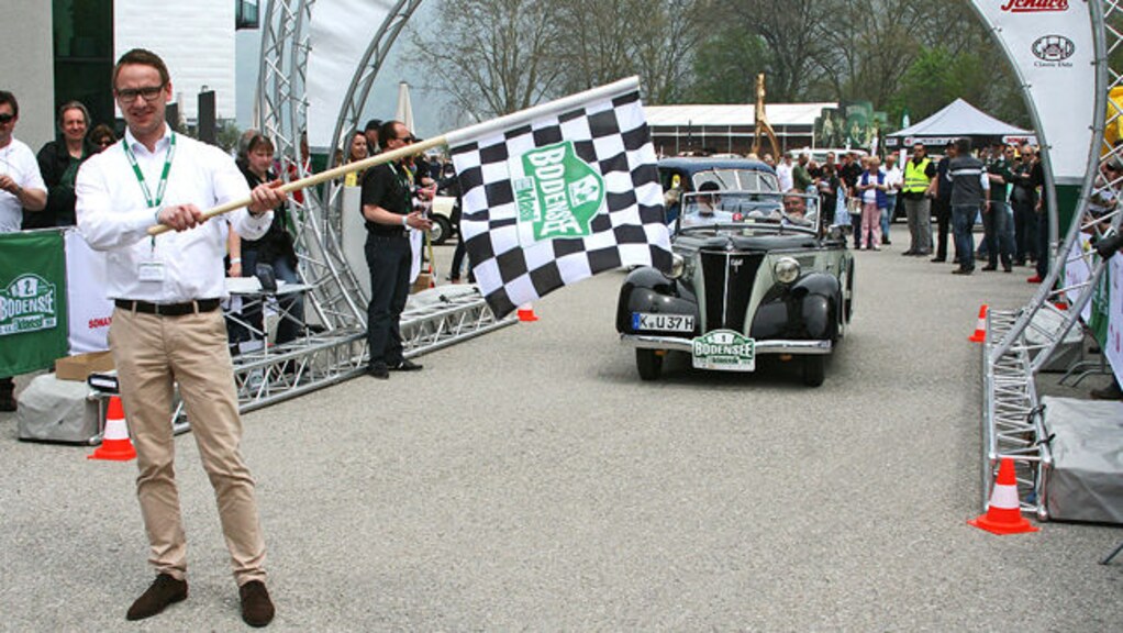 Pünktlich um 14 Uhr rollt das Ford Eifel Cabriolet mit der Startnummer 1 durch das Startertor und gibt damit den Auftakt zum Start der 2. Bodensee-Klassik. 2013 führt die Rallye alle Teilnehmer über 584 Kilometer durch Deutschland, Liechtenstein, Österreich und die Schweiz. Vor dem Start wurden die 156 Teams vom Sportlichen Leiter Peter Göbel noch einmal gebrieft. Wer glaubte, schon alles zu wissen, erfuhr hier beispielsweise, dass ein Schweizer Fahrer am Steuer eines in Deutschland zugelassenen Fahrzeugs nicht in die Schweiz einfahren sollte. Wenn man ihn dabei erwischt, sind sofort zehn Prozent des Fahrzeugwertes als Zollgebühr fällig und dazu weitere 19 Prozent Mehrwertsteuer.