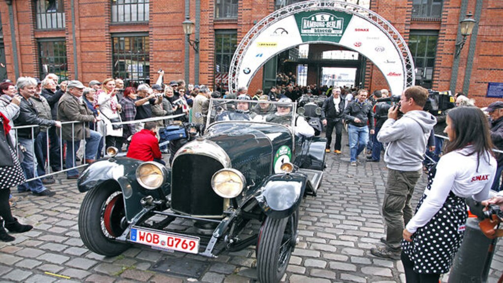 Großes Hallo auf dem Hamburger Fischmarkt: 182 Klassiker glänzen am Mittwoch im Sonnenlicht. Die Teilnehmer der fünften Ausgabe der Hamburg-Berlin-Klassik warten auf den Startschuss zur ersten Etappe.