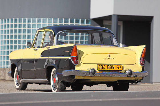 Spitze Flossen, hintere Panoramascheibe, selbstbewussteres Gesicht mit Scheinwerfer-Schirmchen, Sicken im Dach, viel Lametta im Cockpit und 23 Zentimeter mehr Gesamtlänge sind das Werk des italienischen Gestalters Luigi Rapi (bekannt durch die Autobianchi Bianchina); Fords Designabteilung in Dearborn soll aber auch geholfen haben. Von vorn sieht die Vedette deshalb aus wie ein 1955er Packard Clipper, von der Seite wie ein 1958er Edsel. Frankreich ist damals viel stärker amerikanisiert als Deutschland: mit Hollywood-Stars, die Asyl an der Côte d’Azur suchen, mit Motels und Bungalow-Siedlungen an den Stadträndern und vornehmen Frauen, die Zigaretten als Modeaccessoire einsetzen. Als solches steht die Spitzflossen-Vedette schon damals nicht jedem. Schauspielerin Martine Carol ("Lola Montez") kauft eine Beaulieu, Sportwagen-Fan Lino Ventura entscheidet sich für eine Chambord – der Familie wegen. Frankreichs größter Star, die Bardot, hat’s nicht so mit Viertürern, lässt sich aber immerhin am Steuer ihres Simca Aronde Week-End Cabrio sehen. Wohlhabenden Wurstfabrikanten und Kleinstadt-Advokaten aber schmeckt die Vedette oft besser als Citroëns kühne DS. Der Gegenwert dreier Enten (1.174.850 alte Francs) für eine Chambord gilt als angemessen – wenn auch ein altbackener V8 unter der Haube schnauft. Denn ausgerechnet den hat Simca nicht angerührt: Firmenchef Pigozzi scheute die Kosten einer Weiterentwicklung zum Stößelstangen-V8 mit 100 und mehr PS. So bleibt es bei 2,4 Litern und nunmehr 84 PS bei 4800 Touren. Das garantiert vor allem großen Durst, bedeutet aber in den Augen sportlicher Fahrer noch nicht mal genug Kraft, um ein Crêpe umzudrehen. Immerhin reicht es Monsieur le Président de la République ab 1959 zum Paradieren: Er bestellt zwei viertürige Cabrios und gleich zwei Dutzend Vedette Présidence für den staatlichen Fuhrpark.