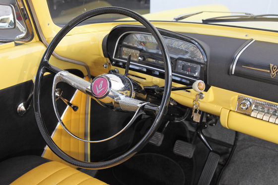 Drei Gänge und Lenkradschaltung hat der Fahrer einer Vedette zur Verfügung. Eine Automatik gab es nie, nur gegen Aufpreis eine Art Overdrive namens "Rushmatic". Sich am Lenkrad festzuhalten ist das Mittel der Wahl, ...