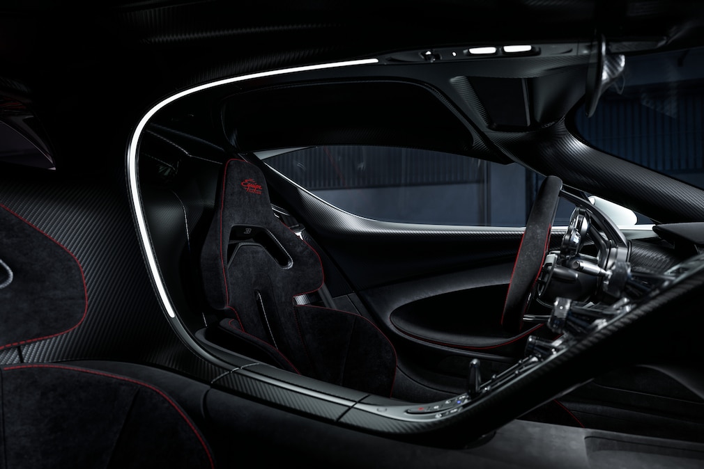 Das klassische Layout des Chiron wird beibehalten. Die oberste Prämisse für das Cockpit lautet weiterhin: Zeitlosigkeit. Der Tourbillon soll auch in vielen Jahrzehnten noch zeitlos wirken, weshalb Bugatti auf sichtbare Bildschirme verzichtet.