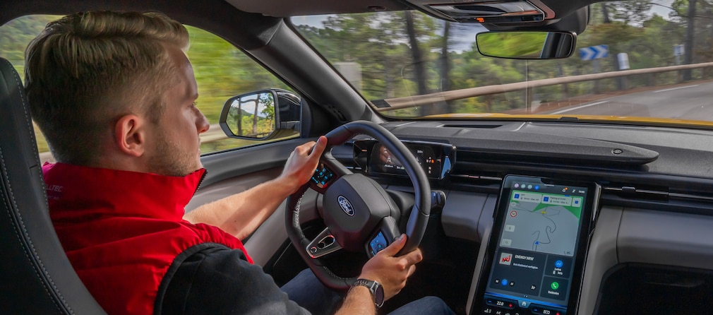 Wer sich im Innenraum des neuen Ford Capri umschaut, der wird zwangsläufig an den elektrischen Explorer erinnert: Bis auf ein paar Details sind die beiden Modelle identisch. Einzig das neue Lenkrad mit der an den alten Capri angelehnten gelochten unteren Speiche ist neu.