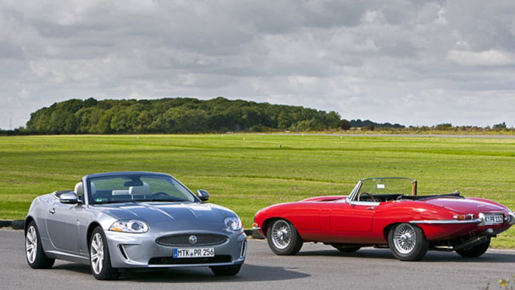 Das halbe Auto – NUR Motorhaube. Gewaltig! Der Jaguar E-Type steht da wie eine Skulptur. Zu Recht genießt er den zweifelhaften Ruf eines Phallussymbols. Als er Anfang der sechziger Jahre vorgestellt wurde, wirkte er so futuristisch wie eine fliegende Untertasse und bis heute bleibt er DAS Modell, von dem Jaguar seine Identität ableitet. So gewaltig wie der E-Type damals erschien, so zierlich wirkt er neben der aktuell stärksten Raubkatze. Der Jaguar XKR übertrifft die legendärste Wildkatze mit imposanten Abmessungen. Fast zierlich wirkt der E-Type gegen ihn.